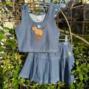 CONJUNTO INFANTIL CAPIVARA MALHA JEANS SAIA SHORT E REGATA
