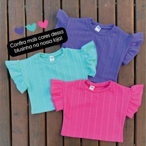 Blusinha infantil com modelagem cropped (mais curtinha na barra) e manguinhas com babadinhos. Super charmosa e, ao mesmo tempo, coringa para combinar com vários lookinhos nessa estação.
