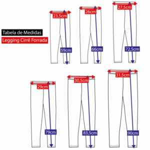A tabela de medidas pode conter variação de 1cm pois as leggings são costuradas manualmente uma a uma.