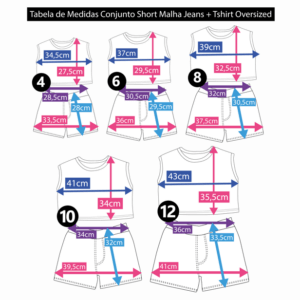 Tamanho: 10 Anos – Cintura: 31cm (sem esticar o elástico) – Altura: 34cm (do cós até a barra saia) – Quadril (medida do Shortinho): 39cm