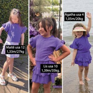 Tamanho 4 anos: Cintura 25cm (sem esticar o elástico), Altura 24,5cm (dó cós até a barra da saia), Quadril do Short 39,5cm (sem esticar a malha) e Perninha do Short 21cm (de frente sem esticar a malha).