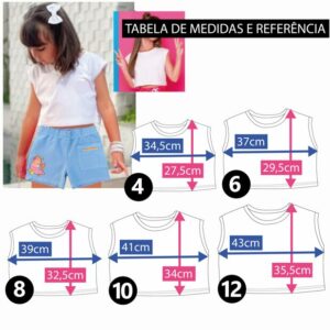 Tamanho 4 Anos: Peito 34,5cm e Altura 27,5cm (da costura do ombro até a barra da blusa).
