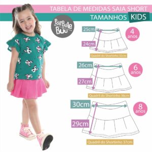 Tamanho: 6 Anos – Cintura: 26cm (sem esticar o elástico) – Altura: 27cm (do cós até a barra saia) – Quadril (medida do Shortinho): 36cm