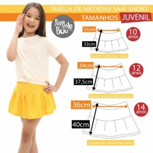 Tamanho: 12 Anos – Cintura: 34cm (sem esticar o elástico) – Altura: 37,5cm (do cós até a barra saia) – Quadril (medida do Shortinho): 45,5cm