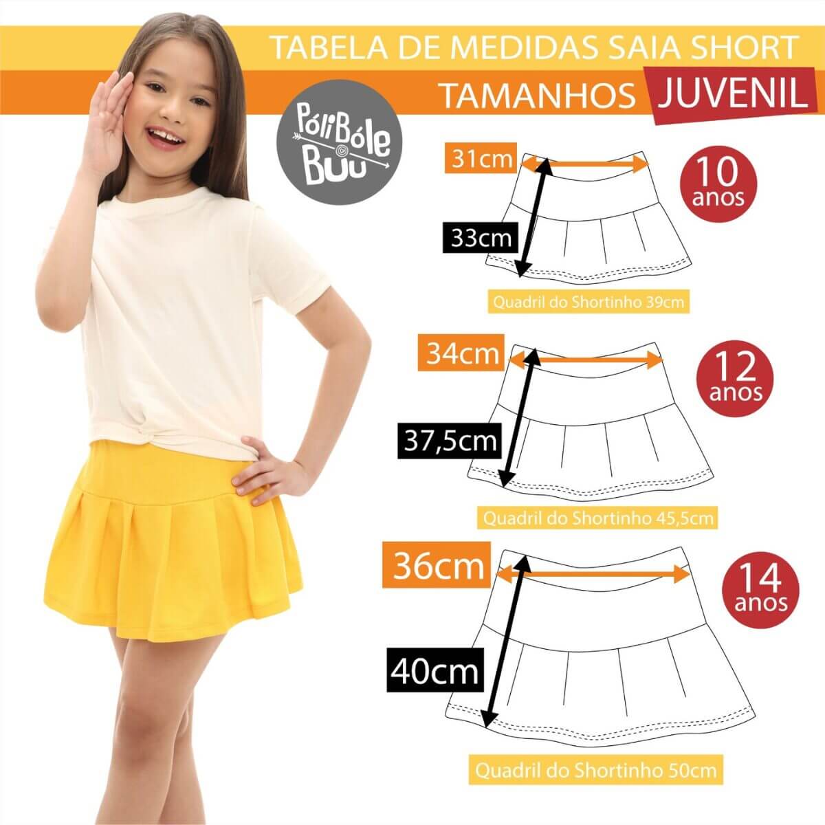 Tamanho: 10 Anos – Cintura: 31cm (sem esticar o elástico) – Altura: 33cm (do cós até a barra saia) – Quadril (medida do Shortinho): 39cm