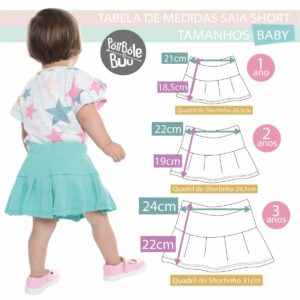 Tamanho: 1 ano – Cintura: 21cm (sem esticar o elástico) – Altura: 18,5cm (do cós até a barra saia) – Quadril (medida do Shortinho): 26,5cm