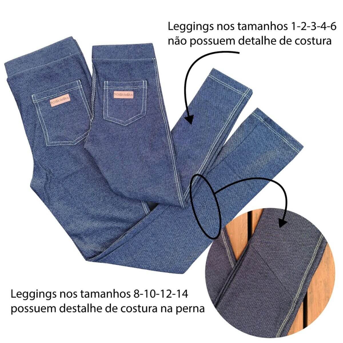 Tamanho 10 Anos: Altura 80,5cm (do cós até a barra), Quadril 40cm (somente frente e sem esticar a malha), Cintura 31,5cm (somente frente e sem esticar o elástico), Coxa 20cm (somente frente sem esticar a malha) e Cavalo 25,5cm.