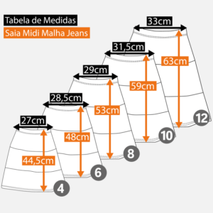 Tamanho 12: Cintura 33cm (de frente sem esticar o elástico) e Altura 63cm (do cós até a barra da saia).