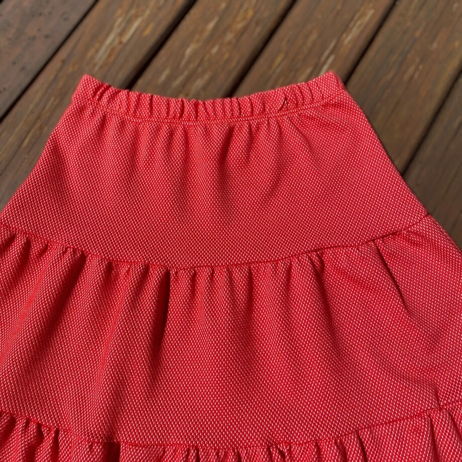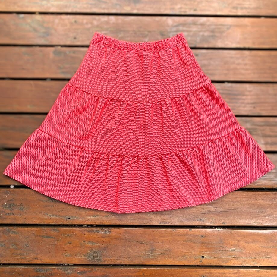 Tamanho 8: Cintura 29cm (somente frente sem esticar o elástico) e Altura 53cm (do cós até a barra da saia).