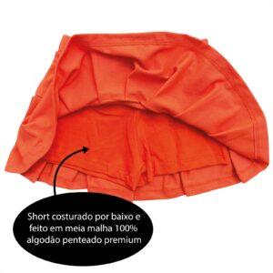 I. Short costurado por baixo da saia feito em 100% algodão penteado, sempre seguindo a cor da saia. Conforto e liberdade de movimento