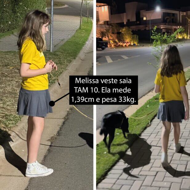 Tamanho: 10 Anos – Cintura: 31 cm (sem esticar o elástico) – Altura: 34 cm (do cós até a barra saia) – Quadril (medida do Shortinho): 39cm