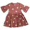 Tamanho 4 anos: Peito 30,5cm, Altura 55,5cm (do ombro até a barra do vestido) e manga 11,5cm (sem esticar a malha).